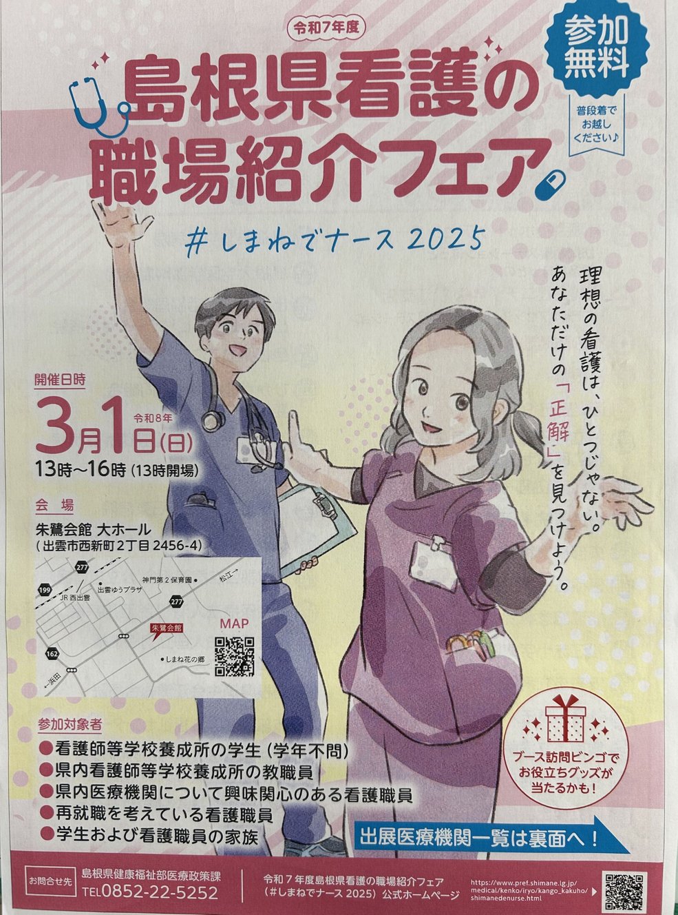 令和8年3月1日(日)13時より、島根県出雲市にある朱鷺(とき)会館にて、島根県看護の職場紹介フェアに当施設の訪問看護ステーションが出展します。ご興味ある方はぜひお立ち寄りください。